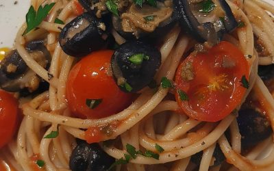 Ingrédients : Spaghettis 500 g pomodori pelati 150 g de salades acciughe 100 g tonno 50 g d’olive nere denocciolate…