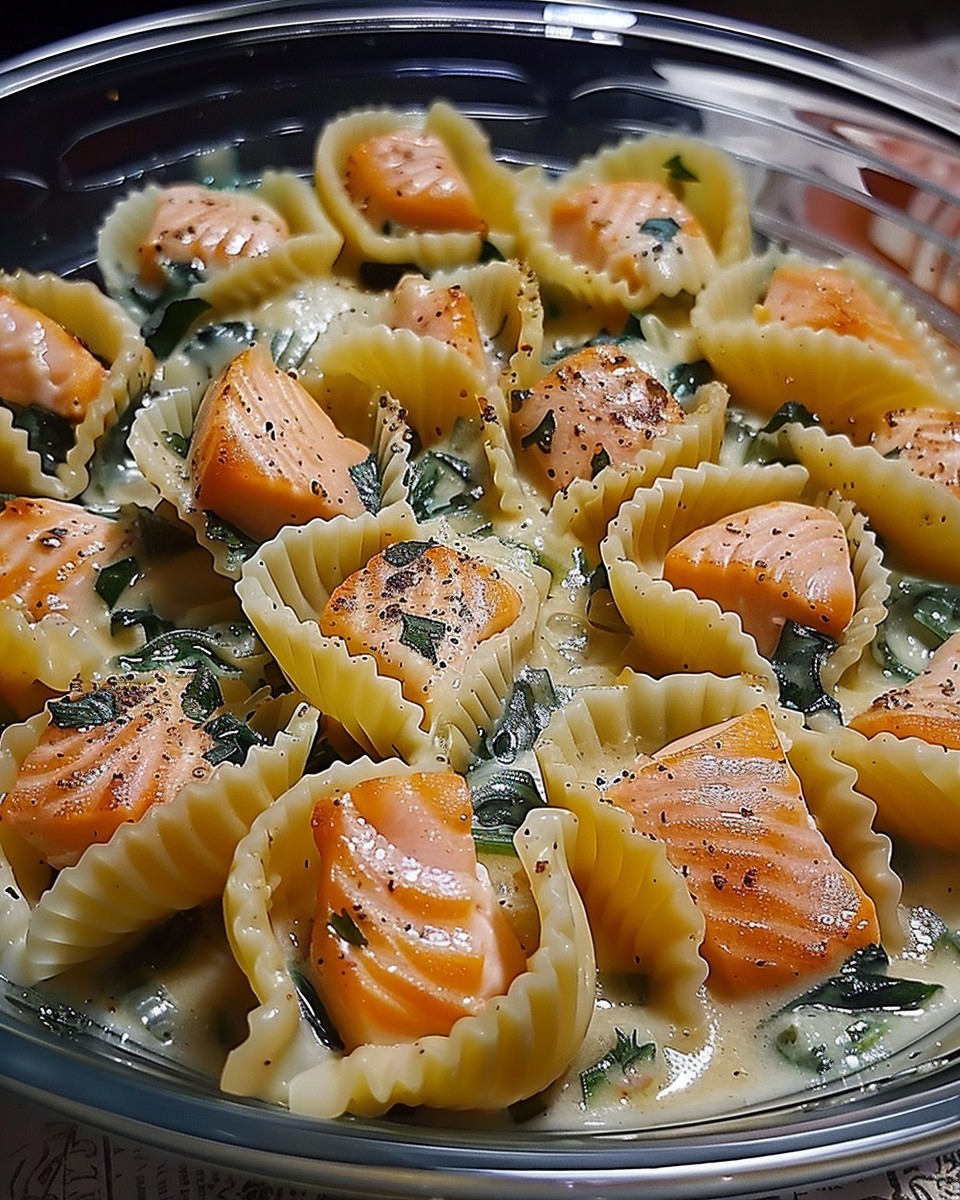 – Conchiglioni – Courgettes – Huile d’olive – Ail – Saumon fumé – Sauce béchamel – Parmesan râpé – Sel – Poivre – Persil haché