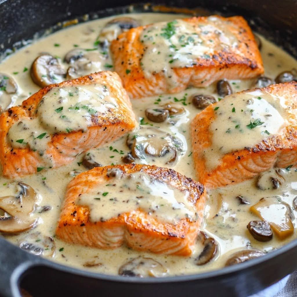 Creamy Garlic Mushroom Salmon is a rich, flavorful dish that combines perfectly seared salmon fillets with a velvety garlic mushroom sauce. The salmon is pan-seared to golden perfection, then smothered in a creamy, Parmesan-infused sauce loaded with sautéed mushrooms and aromatic garlic. This dish is quick, easy, and perfect for a cozy weeknight dinner or an elegant meal to impress guests. Serve it with pasta, rice, or roasted vegetables for a satisfying and delicious experience!
