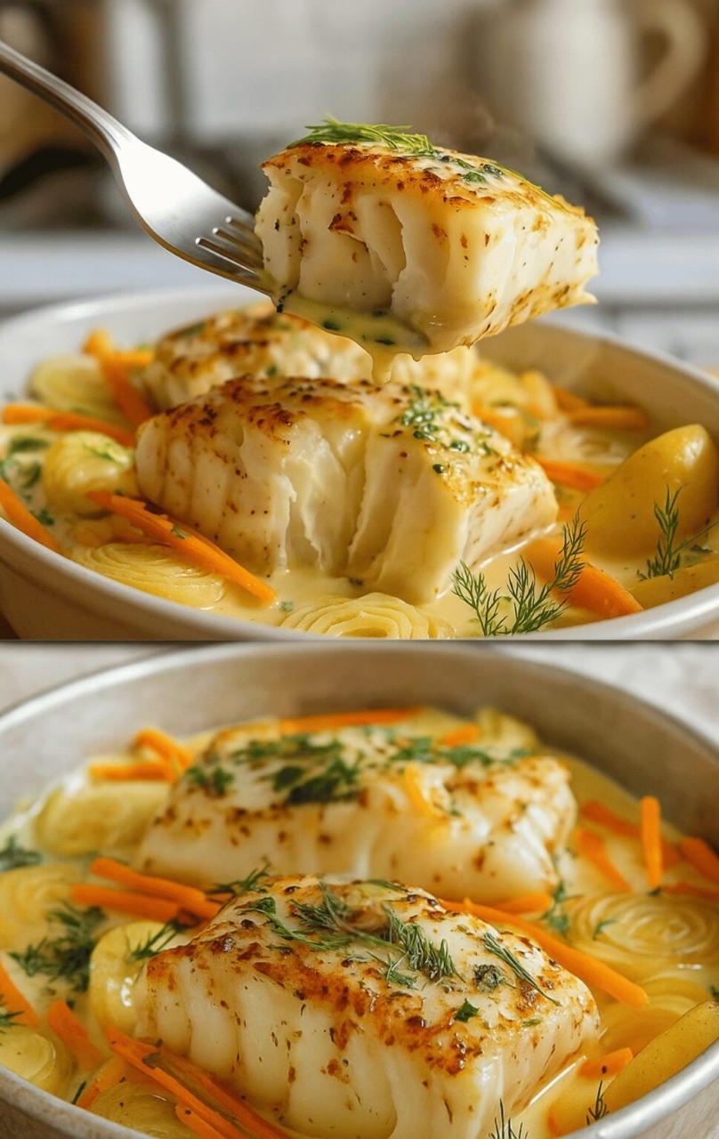 Les filets de cabillaud au four avec sauce crémeuse, pommes de terre et carottes sont une recette simple, équilibrée et raffinée. Le cabillaud fondant s’associe à la douceur des légumes et à une sauce légère et parfumée, pour un repas complet et réconfortant. Parfait pour un déjeuner en famille ou un dîner sain et savoureux.