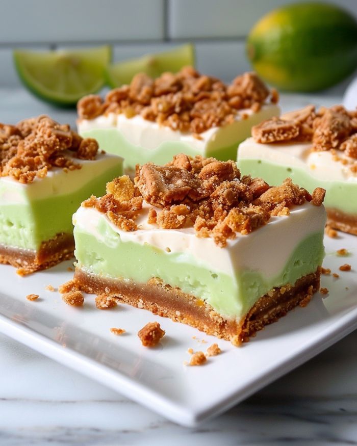 Ces barres à la tarte au citron vert sont parfaites seules, mais si vous souhaitez les accompagner d’un petit quelque chose, pensez à les servir avec une salade de fruits frais ou une boule de glace à la vanille. Une salade verte légère avec une vinaigrette acidulée peut également parfaitement équilibrer leur douceur. Pour une touche originale, vous pouvez même les accompagner d’un repas tropical, composé de crevettes à la noix de coco ou de brochettes d’ananas grillé.
