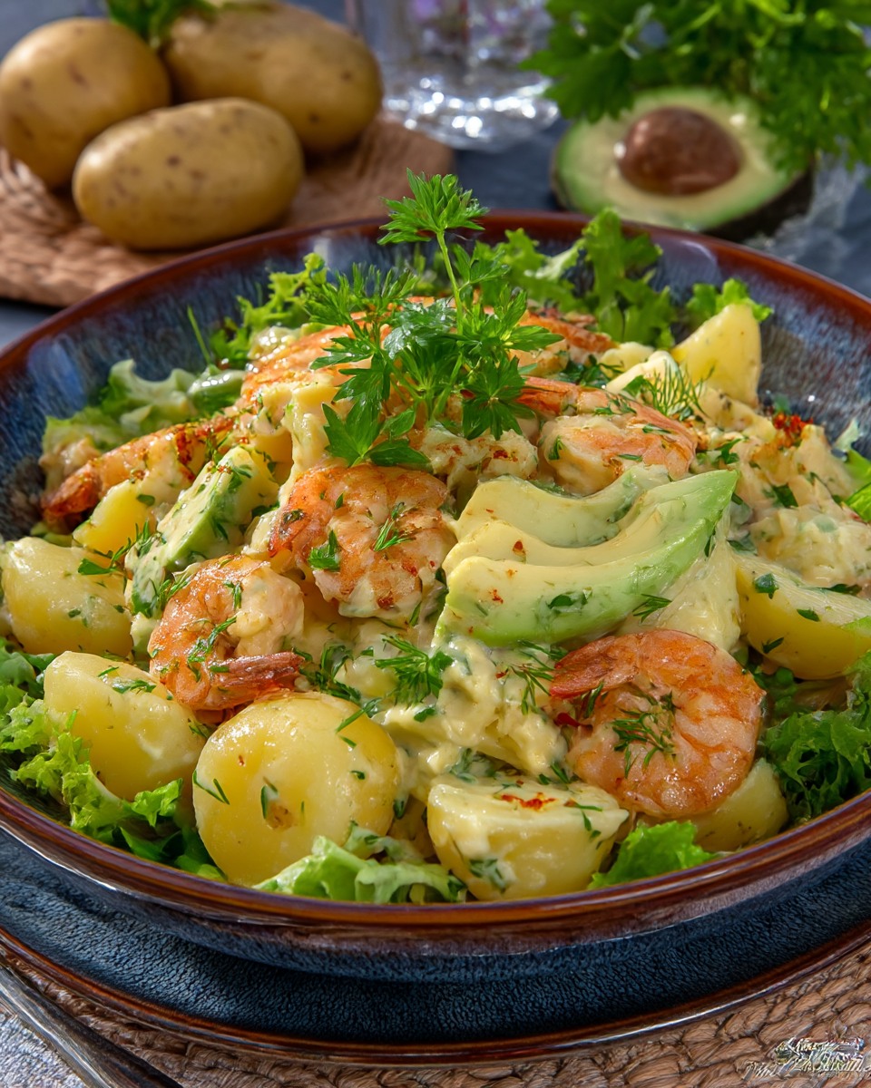 Salade de pommes de terre aux crevettes, avocat et herbes fraîches