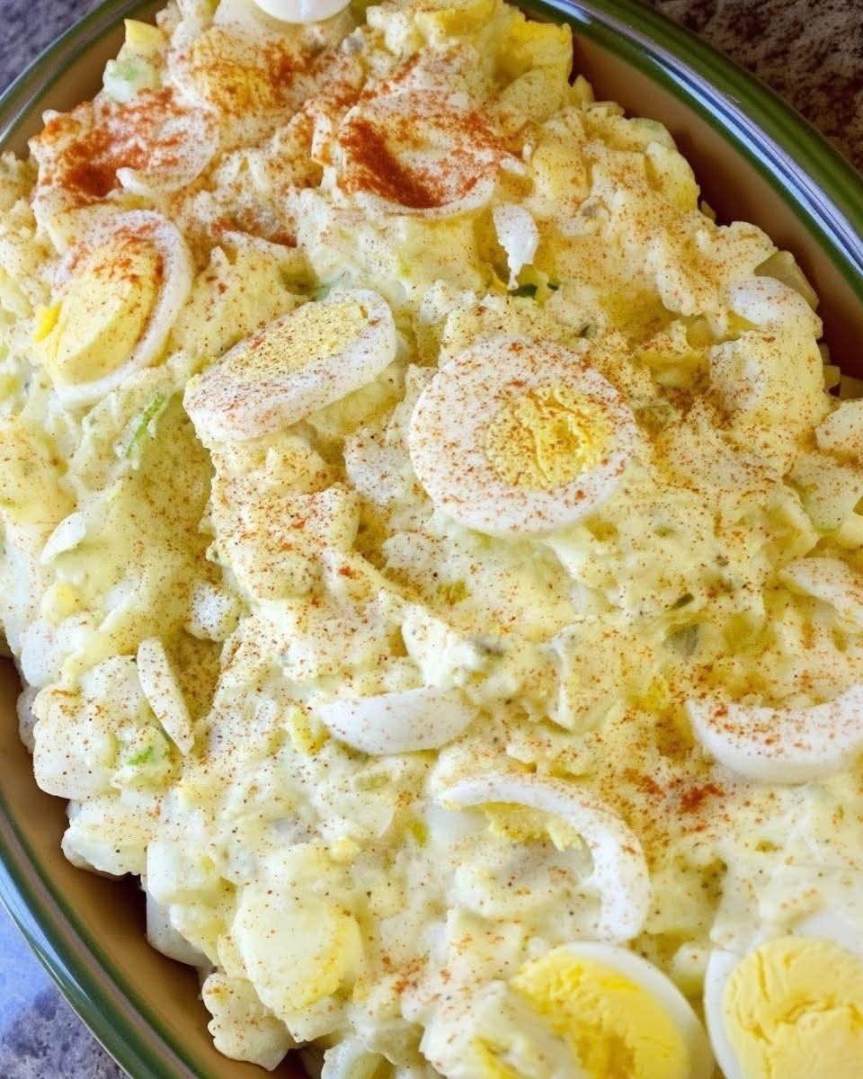 Lorsqu’il s’agit de nourriture réconfortante, rien ne vaut un grand bol de salade de pommes de terre du Sud crémeuse et acidulée avec des œufs. Des pommes de terre tendres, une relish de cornichons à l’aneth, du céleri, de l’oignon et une vinaigrette mayo-moutarde parfaitement équilibrée, finie avec des œufs tranchés et un saupoudrage de paprika. Idéal pour les barbecues, les dîners de poulet frit, les pique-piques et les rassemblements de vacances.